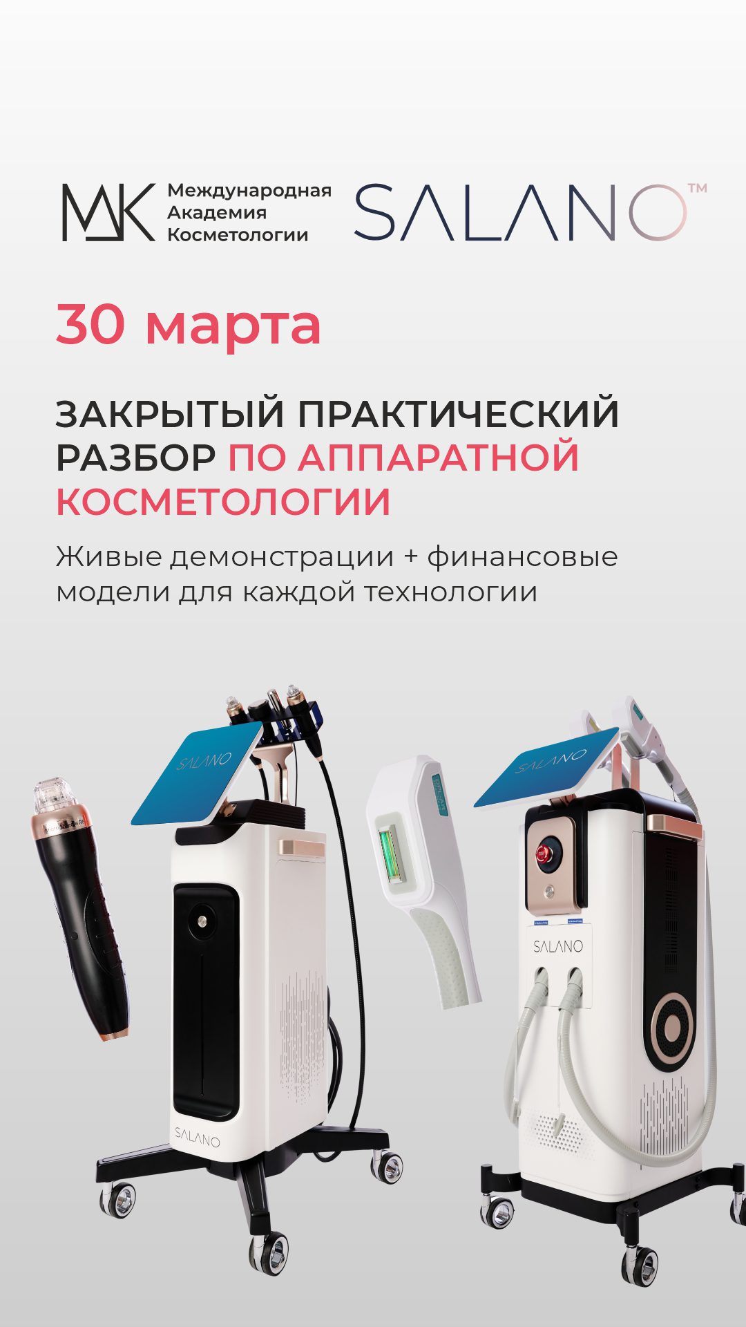 30–31 марта SALANO при поддержке Международной Академии Косметологии (МАК) проводит двухдневный интенсив для практикующих специалистов. В программе — живые демонстрации, разбор клинических кейсов, мастер‑классы и практические доклады по монетизации услуг и удержанию пациентов. Места ограничены — регистрация обязательна.